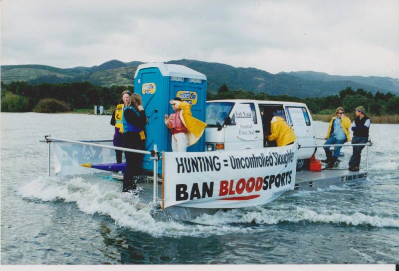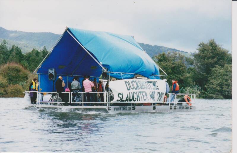 Three of the Myark amphibious folding trailer barges donated to SAFE "Save Animals From Exploitation" on opening day duck shooting with a band playing loud music to scare the ducks away.